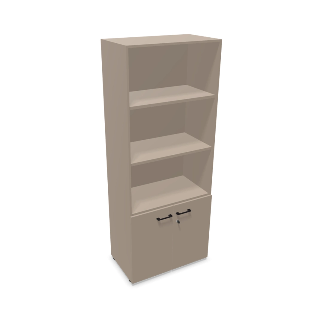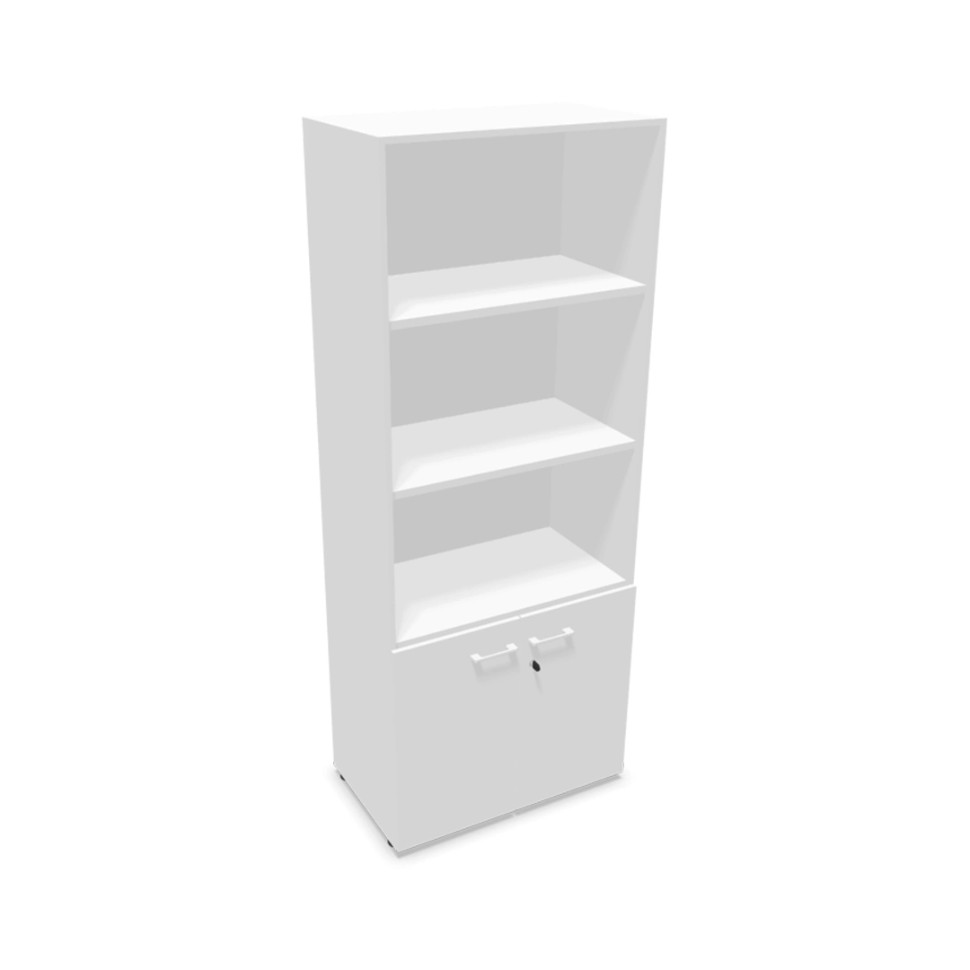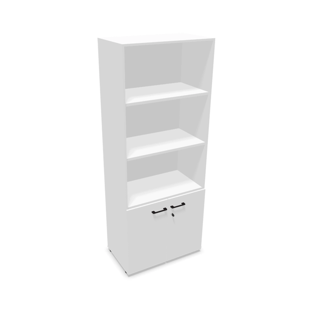 Bibliothèque mélaminée avec partie haute ouverte et partie basse fermée par portes battantes.