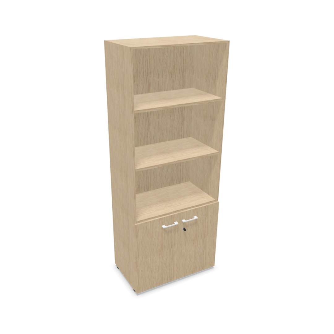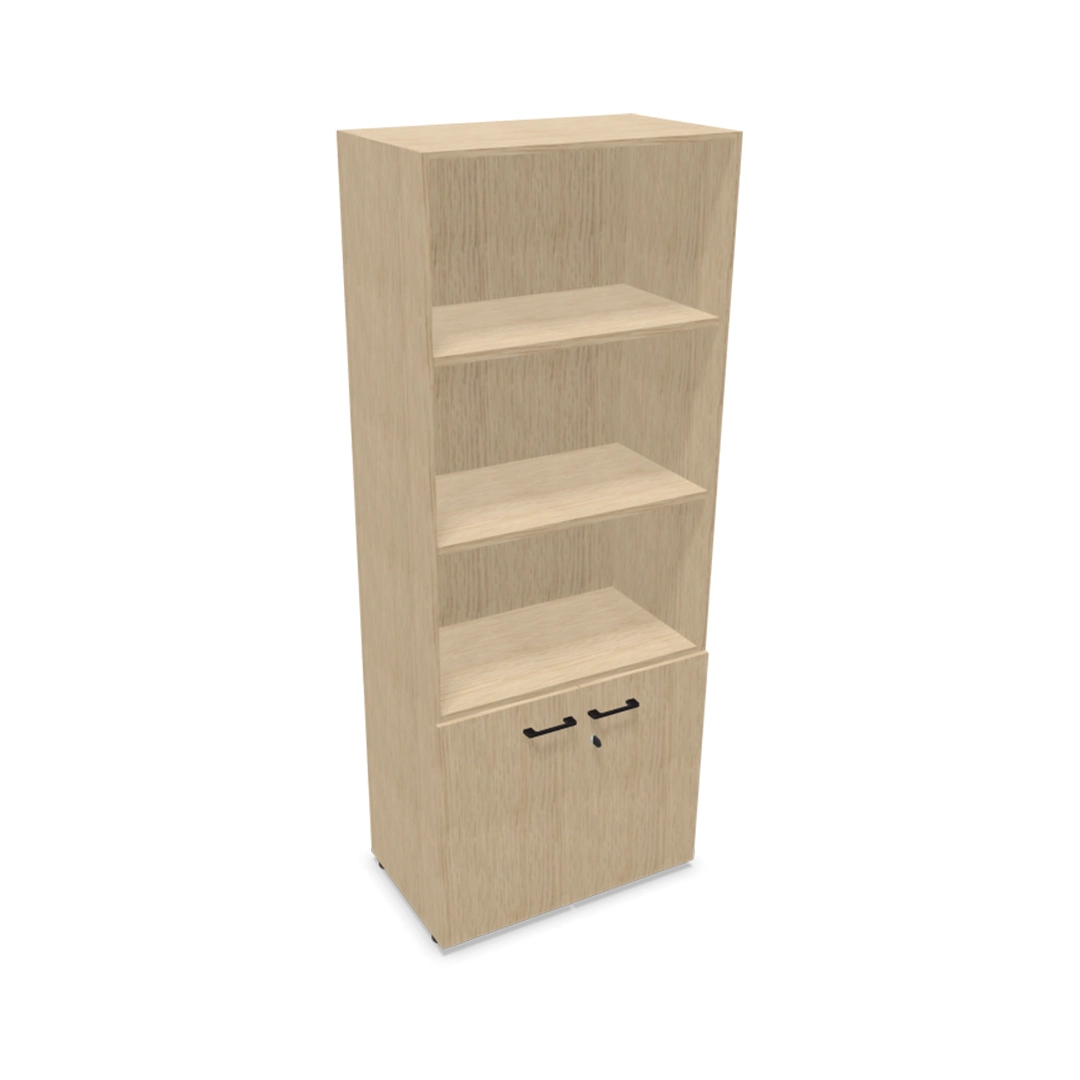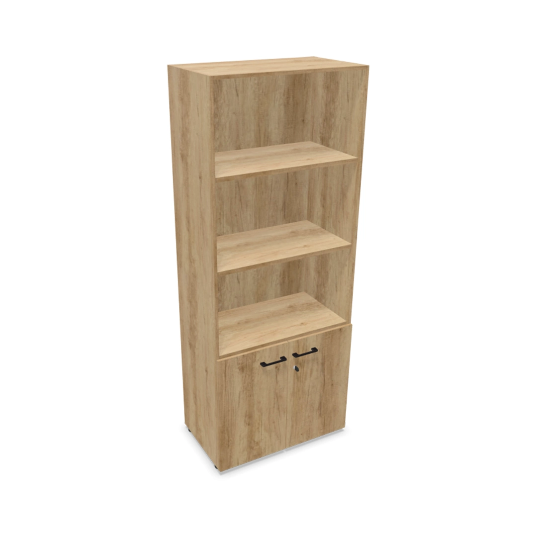 Bibliothèque mélaminée avec partie haute ouverte et partie basse fermée par portes battantes.