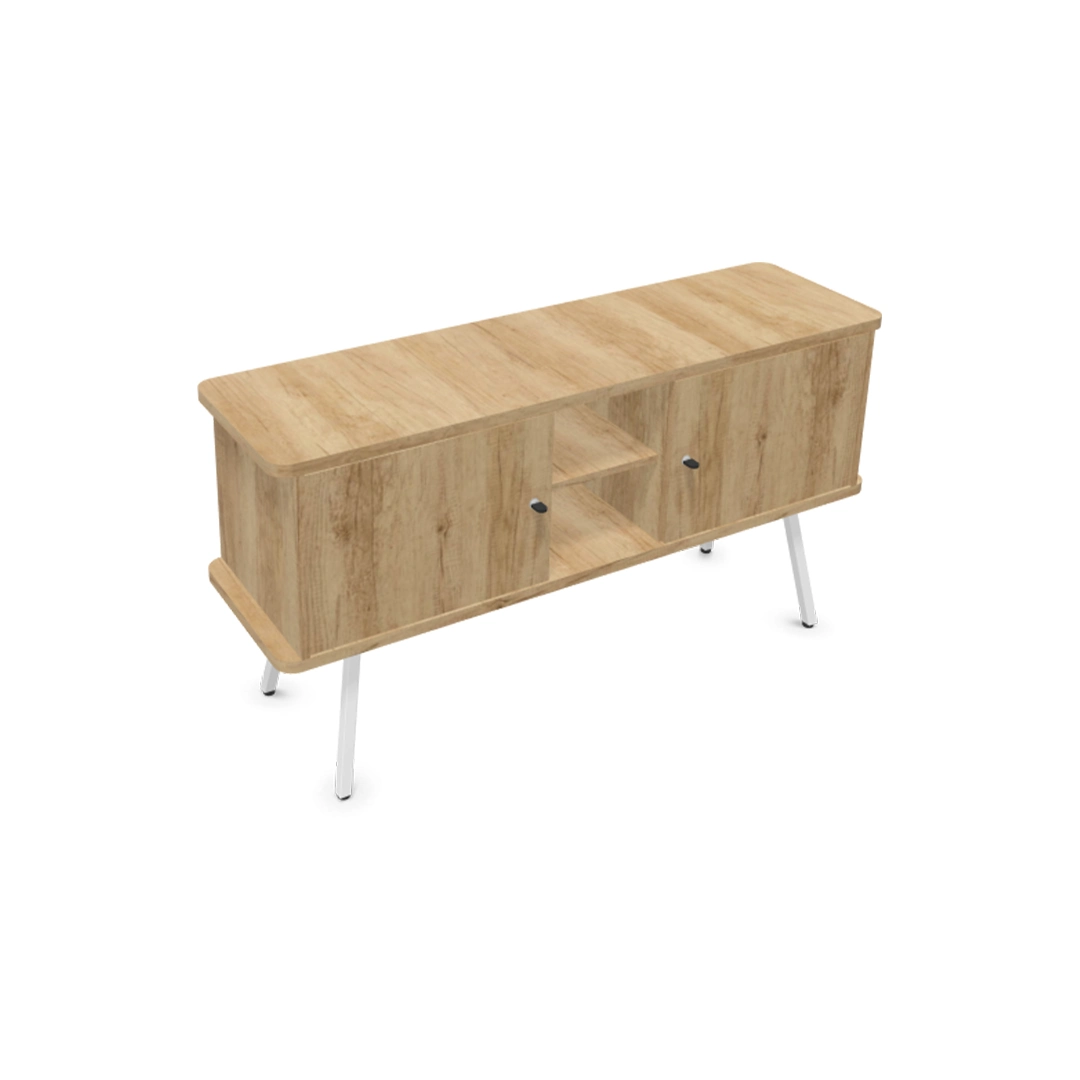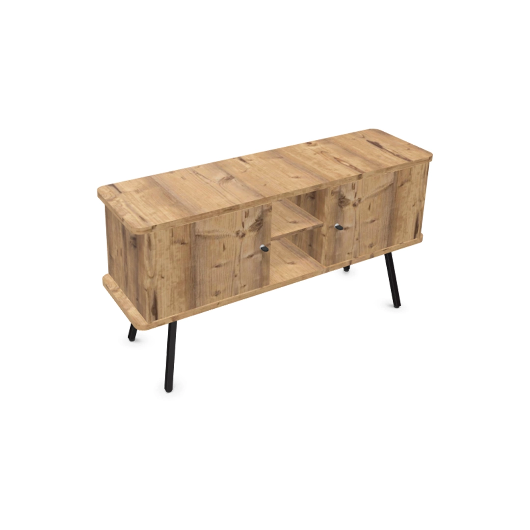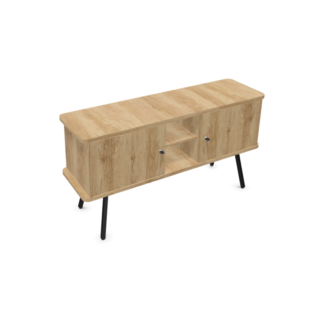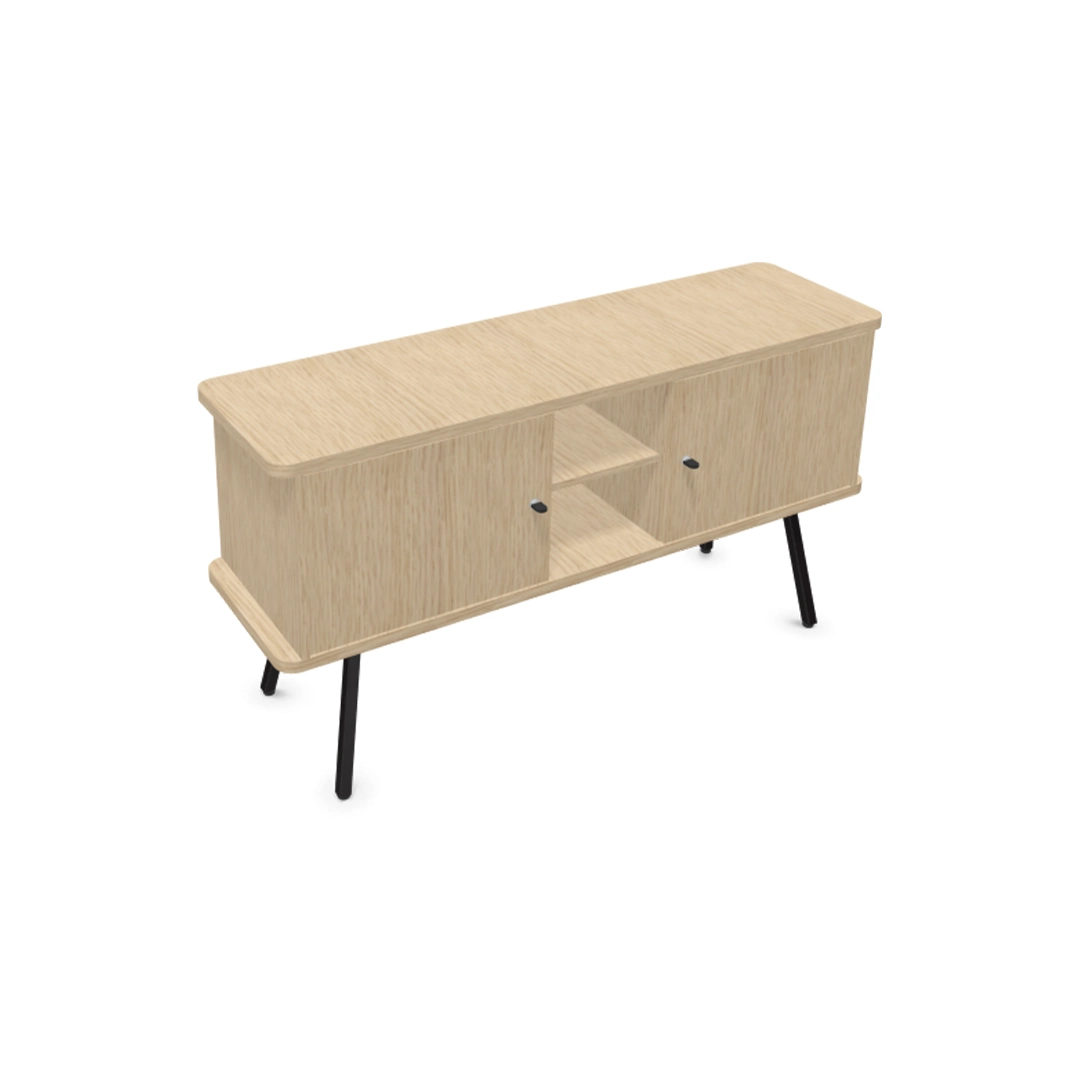 Cette console Alto repose sur 4 pieds métalliques de hauteur 32.2 cm. Elle est composée d’une tablette top et d’une tablette basse d’épaisseur 2.5 cm de même coloris que les tablettes intermédiaires, les joues et les portes. Outre le piétement, l’ensemble du meuble est de couleur unie, à choisir parmi 4 finitions : blanc, chêne fil, Nebraska et Timber.