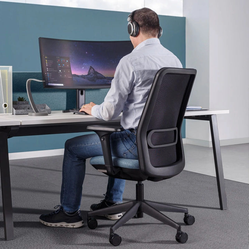 Fauteuil de bureau avec dossier résille et divers réglages ergonomiques.