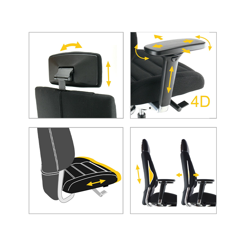 - Accoudoirs réglables 4D : en hauteur par bouton, manchettes avec translation avant/arrière, translation en largeur et pivotantes sur 5 positions.